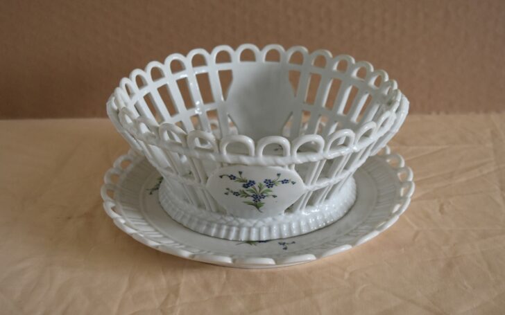Corbeille et son présentoir Diamètre présentoir 25.00 cm largeur totale corbeille 22.30 cm Corbeille marquée d’un n Prix 160.00 Euros
