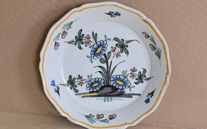 Petit plat sur talon diamètre 21.30 cm Usures d’email sur le fond et au talon +égerenures sur la tranche Période Fränkel und Schreck 1744-1747 Prix 180.00 Euros